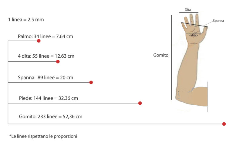 Tutte queste grandezze erano multipli di un’unica unità che veniva chiamata lineacorrispondente a circa 2,5 mm (2,247mm). Se adesso proviamo ad usare la successione di Fibonacci con la linea usata nel medioevo otteniamo un risultato sorprendente: 2,24 mm + 2,24 + 4,49 + 6,74 + 11,23 + 17,97 + 29,20 + 47,17 + 76,37 + 123,54 + 200….